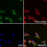 Immunofluorescent analysis of TMEM192 staining in A375 cells. Formalin-fixed cells were permeabilized with 0.1% Triton X-100 in TBS for 5-10 minutes and blocked with 3% BSA-PBS for 30 minutes at room temperature. Cells were probed with the primary antibody in 3% BSA-PBS and incubated overnight at 4 °C in a hidified chamber. Cells were washed with PBST and incubated with a AF488-conjugated secondary antibody (green) in PBS at room temperature in the dark. Phalloidin - AF594 was used to stain Actin filaments (red). DAPI was used to stain the cell nuclei (blue).