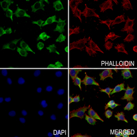Immunofluorescent analysis of PGM1 staining in A375 cells. Formalin-fixed cells were permeabilized with 0.1% Triton X-100 in TBS for 5-10 minutes and blocked with 3% BSA-PBS for 30 minutes at room temperature. Cells were probed with the primary antibody in 3% BSA-PBS and incubated overnight at 4 °C in a hidified chamber. Cells were washed with PBST and incubated with a AF488-conjugated secondary antibody (green) in PBS at room temperature in the dark. Phalloidin - AF594 was used to stain Actin filaments (red). DAPI was used to stain the cell nuclei (blue).