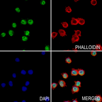 Immunofluorescent analysis of NR1D1 staining in A375 cells. Formalin-fixed cells were permeabilized with 0.1% Triton X-100 in TBS for 5-10 minutes and blocked with 3% BSA-PBS for 30 minutes at room temperature. Cells were probed with the primary antibody in 3% BSA-PBS and incubated overnight at 4 °C in a hidified chamber. Cells were washed with PBST and incubated with a AF488-conjugated secondary antibody (green) in PBS at room temperature in the dark. Phalloidin - AF594 was used to stain Actin filaments (red). DAPI was used to stain the cell nuclei (blue).