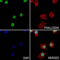 Immunofluorescent analysis of SET staining in A375 cells. Formalin-fixed cells were permeabilized with 0.1% Triton X-100 in TBS for 5-10 minutes and blocked with 3% BSA-PBS for 30 minutes at room temperature. Cells were probed with the primary antibody in 3% BSA-PBS and incubated overnight at 4 °C in a hidified chamber. Cells were washed with PBST and incubated with a AF488-conjugated secondary antibody (green) in PBS at room temperature in the dark. Phalloidin - AF594 was used to stain Actin filaments (red). DAPI was used to stain the cell nuclei (blue).