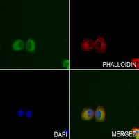 Immunofluorescent analysis of POR staining in A375 cells. Formalin-fixed cells were permeabilized with 0.1% Triton X-100 in TBS for 5-10 minutes and blocked with 3% BSA-PBS for 30 minutes at room temperature. Cells were probed with the primary antibody in 3% BSA-PBS and incubated overnight at 4 °C in a hidified chamber. Cells were washed with PBST and incubated with a AF488-conjugated secondary antibody (green) in PBS at room temperature in the dark. Phalloidin - AF594 was used to stain Actin filaments (red). DAPI was used to stain the cell nuclei (blue).