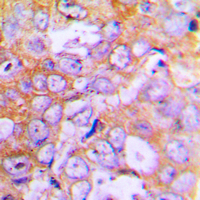 Immunohistochemical analysis of Beta-actin staining in human lung cancer formalin fixed paraffin embedded tissue section. The section was pre-treated using heat mediated antigen retrieval with sodium citrate buffer (pH 6.0). The section was then incubated with the antibody at room temperature and detected using an HRP conjugated compact polymer system. DAB was used as the chromogen. The section was then counterstained with haematoxylin and mounted with DPX. -