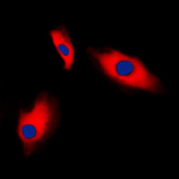 Immunofluorescent analysis of Alpha-actin-3 staining in HeLa cells. Formalin-fixed cells were permeabilized with 0.1% Triton X-100 in TBS for 5-10 minutes and blocked with 3% BSA-PBS for 30 minutes at room temperature. Cells were probed with the primary antibody in 3% BSA-PBS and incubated overnight at 4 °C in a humidified chamber. Cells were washed with PBST and incubated with a DyLight 594-conjugated secondary antibody (red) in PBS at room temperature in the dark. DAPI was used to stain the cell nuclei (blue).