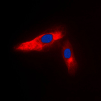 Immunofluorescent analysis of ACTN3 staining in HeLa cells. Formalin-fixed cells were permeabilized with 0.1% Triton X-100 in TBS for 5-10 minutes and blocked with 3% BSA-PBS for 30 minutes at room temperature. Cells were probed with the primary antibody in 3% BSA-PBS and incubated overnight at 4 °C in a humidified chamber. Cells were washed with PBST and incubated with a DyLight 594-conjugated secondary antibody (red) in PBS at room temperature in the dark. DAPI was used to stain the cell nuclei (blue).