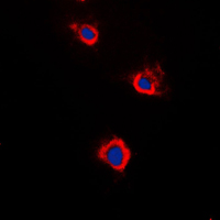 Immunofluorescent analysis of Adenylate Cyclase 5/6 staining in Raw264.7 cells. Formalin-fixed cells were permeabilized with 0.1% Triton X-100 in TBS for 5-10 minutes and blocked with 3% BSA-PBS for 30 minutes at room temperature. Cells were probed with the primary antibody in 3% BSA-PBS and incubated overnight at 4 °C in a humidified chamber. Cells were washed with PBST and incubated with a DyLight 594-conjugated secondary antibody (red) in PBS at room temperature in the dark. DAPI was used to stain the cell nuclei (blue).