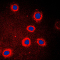 Immunofluorescent analysis of Adenylate Cyclase 9 staining in HeLa cells. Formalin-fixed cells were permeabilized with 0.1% Triton X-100 in TBS for 5-10 minutes and blocked with 3% BSA-PBS for 30 minutes at room temperature. Cells were probed with the primary antibody in 3% BSA-PBS and incubated overnight at 4 °C in a humidified chamber. Cells were washed with PBST and incubated with a DyLight 594-conjugated secondary antibody (red) in PBS at room temperature in the dark. DAPI was used to stain the cell nuclei (blue).