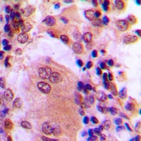 Immunohistochemical analysis of AKT (Phospho-T308) staining in human lung cancer formalin fixed paraffin embedded tissue section. The section was pre-treated using heat mediated antigen retrieval with sodium citrate buffer (pH 6.0). The section was then incubated with the antibody at room temperature and detected using an HRP conjugated compact polymer system. DAB was used as the chromogen. The section was then counterstained with haematoxylin and mounted with DPX. -