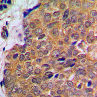 Immunohistochemical analysis of AKT staining in human breast cancer formalin fixed paraffin embedded tissue section. The section was pre-treated using heat mediated antigen retrieval with sodium citrate buffer (pH 6.0). The section was then incubated with the antibody at room temperature and detected using an HRP conjugated compact polymer system. DAB was used as the chromogen. The section was then counterstained with haematoxylin and mounted with DPX.