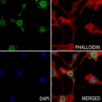 Immunofluorescent analysis of Annexin A2 staining in NIH3T3 cells. Formalin-fixed cells were permeabilized with 0.1% Triton X-100 in TBS for 5-10 minutes and blocked with 3% BSA-PBS for 30 minutes at room temperature. Cells were probed with the primary antibody in 3% BSA-PBS and incubated overnight at 4 °C in a hidified chamber. Cells were washed with PBST and incubated with a AF488-conjugated secondary antibody (green) in PBS at room temperature in the dark. Phalloidin - AF594 was used to stain Actin filaments (red). DAPI was used to stain the cell nuclei (blue).