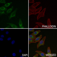 Immunofluorescent analysis of ATP5A1 staining in MCF7 cells. Formalin-fixed cells were permeabilized with 0.1% Triton X-100 in TBS for 5-10 minutes and blocked with 3% BSA-PBS for 30 minutes at room temperature. Cells were probed with the primary antibody in 3% BSA-PBS and incubated overnight at 4 °C in a hidified chamber. Cells were washed with PBST and incubated with a AF488-conjugated secondary antibody (green) in PBS at room temperature in the dark. Phalloidin - AF594 was used to stain Actin filaments (red). DAPI was used to stain the cell nuclei (blue).