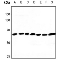 Western blot analysis of ATP5A1 expression in HEK293T (A), Hela (B), H446 (C), mouse lung (D), mouse liver (E), rat lung (F), rat liver (G) whole cell lysates. (Predicted band size: 59 kD; Observed band size: 60 kD) -