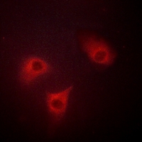 Immunofluorescent analysis of BAK staining in HeLa cells. Formalin-fixed cells were permeabilized with 0.1% Triton X-100 in TBS for 5-10 minutes and blocked with 3% BSA-PBS for 30 minutes at room temperature. Cells were probed with the primary antibody in 3% BSA-PBS and incubated overnight at 4 °C in a hidified chamber. Cells were washed with PBST and incubated with a AF594-conjugated secondary antibody (red) in PBS at room temperature in the dark.