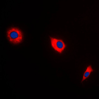 Immunofluorescent analysis of BAX staining in A549 cells. Formalin-fixed cells were permeabilized with 0.1% Triton X-100 in TBS for 5-10 minutes and blocked with 3% BSA-PBS for 30 minutes at room temperature. Cells were probed with the primary antibody in 3% BSA-PBS and incubated overnight at 4 °C in a humidified chamber. Cells were washed with PBST and incubated with a DyLight 594-conjugated secondary antibody (red) in PBS at room temperature in the dark. DAPI was used to stain the cell nuclei (blue).