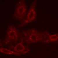 Immunofluorescent analysis of BCL2 staining in HepG2 cells. Formalin-fixed cells were permeabilized with 0.1% Triton X-100 in TBS for 5-10 minutes and blocked with 3% BSA-PBS for 30 minutes at room temperature. Cells were probed with the primary antibody in 3% BSA-PBS and incubated overnight at 4 °C in a humidified chamber. Cells were washed with PBST and incubated with a AF594-conjugated secondary antibody (red) in PBS at room temperature in the dark.