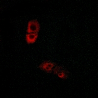 Immunofluorescent analysis of BRS3 staining in A549 cells. Formalin-fixed cells were permeabilized with 0.1% Triton X-100 in TBS for 5-10 minutes and blocked with 3% BSA-PBS for 30 minutes at room temperature. Cells were probed with the primary antibody in 3% BSA-PBS and incubated overnight at 4 °C in a hidified chamber. Cells were washed with PBST and incubated with a AF594-conjugated secondary antibody (red) in PBS at room temperature in the dark.