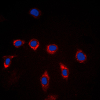 Immunofluorescent analysis of CD157 staining in Raw264.7 cells. Formalin-fixed cells were permeabilized with 0.1% Triton X-100 in TBS for 5-10 minutes and blocked with 3% BSA-PBS for 30 minutes at room temperature. Cells were probed with the primary antibody in 3% BSA-PBS and incubated overnight at 4 °C in a humidified chamber. Cells were washed with PBST and incubated with a DyLight 594-conjugated secondary antibody (red) in PBS at room temperature in the dark. DAPI was used to stain the cell nuclei (blue).