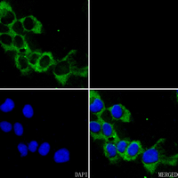 Immunofluorescent analysis of Caspase 3 staining in HEK293T cells. Formalin-fixed cells were permeabilized with 0.1% Triton X-100 in TBS for 5-10 minutes and blocked with 3% BSA-PBS for 30 minutes at room temperature. Cells were probed with the primary antibody in 3% BSA-PBS and incubated overnight at 4 °C in a humidified chamber. Cells were washed with PBST and incubated with a AF488-conjugated secondary antibody (green) in PBS at room temperature in the dark. DAPI was used to stain the cell nuclei (blue).