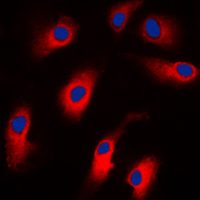 Immunofluorescent analysis of Caspase 7 staining in Jurkat cells. Formalin-fixed cells were permeabilized with 0.1% Triton X-100 in TBS for 5-10 minutes and blocked with 3% BSA-PBS for 30 minutes at room temperature. Cells were probed with the primary antibody in 3% BSA-PBS and incubated overnight at 4 °C in a humidified chamber. Cells were washed with PBST and incubated with a DyLight 594-conjugated secondary antibody (red) in PBS at room temperature in the dark. DAPI was used to stain the cell nuclei (blue).