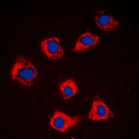 Immunofluorescent analysis of Caspase 9 staining in NIH3T3 cells. Formalin-fixed cells were permeabilized with 0.1% Triton X-100 in TBS for 5-10 minutes and blocked with 3% BSA-PBS for 30 minutes at room temperature. Cells were probed with the primary antibody in 3% BSA-PBS and incubated overnight at 4 °C in a humidified chamber. Cells were washed with PBST and incubated with a DyLight 594-conjugated secondary antibody (red) in PBS at room temperature in the dark. DAPI was used to stain the cell nuclei (blue).