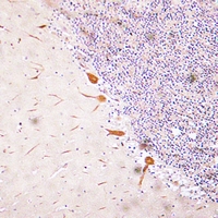 Immunohistochemical analysis of RUNX2 staining in human brain formalin fixed paraffin embedded tissue section. The section was pre-treated using heat mediated antigen retrieval with sodium citrate buffer (pH 6.0). The section was then incubated with the antibody at room temperature and detected using an HRP conjugated compact polymer system. DAB was used as the chromogen. The section was then counterstained with haematoxylin and mounted with DPX. -