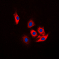 Immunofluorescent analysis of c-CBL (Phospho-Y774) staining in Jurkat cells. Formalin-fixed cells were permeabilized with 0.1% Triton X-100 in TBS for 5-10 minutes and blocked with 3% BSA-PBS for 30 minutes at room temperature. Cells were probed with the primary antibody in 3% BSA-PBS and incubated overnight at 4 °C in a humidified chamber. Cells were washed with PBST and incubated with a DyLight 594-conjugated secondary antibody (red) in PBS at room temperature in the dark. DAPI was used to stain the cell nuclei (blue).