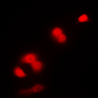 Immunofluorescent analysis of CDC2 staining in K562 cells. Formalin-fixed cells were permeabilized with 0.1% Triton X-100 in TBS for 5-10 minutes and blocked with 3% BSA-PBS for 30 minutes at room temperature. Cells were probed with the primary antibody in 3% BSA-PBS and incubated overnight at 4 °C in a humidified chamber. Cells were washed with PBST and incubated with a DyLight 594-conjugated secondary antibody (red) in PBS at room temperature in the dark.