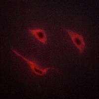 Immunofluorescent analysis of Cadherin 18 staining in HeLa cells. Formalin-fixed cells were permeabilized with 0.1% Triton X-100 in TBS for 5-10 minutes and blocked with 3% BSA-PBS for 30 minutes at room temperature. Cells were probed with the primary antibody in 3% BSA-PBS and incubated overnight at 4 °C in a hidified chamber. Cells were washed with PBST and incubated with a AF594-conjugated secondary antibody (red) in PBS at room temperature in the dark.