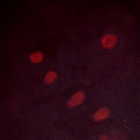 Immunofluorescent analysis of ATF2 (Phospho-S498) staining in HeLa cells. Formalin-fixed cells were permeabilized with 0.1% Triton X-100 in TBS for 5-10 minutes and blocked with 3% BSA-PBS for 30 minutes at room temperature. Cells were probed with the primary antibody in 3% BSA-PBS and incubated overnight at 4 °C in a hidified chamber. Cells were washed with PBST and incubated with a AF594-conjugated secondary antibody (red) in PBS at room temperature in the dark.