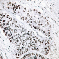 Immunohistochemical analysis of ATF2 (Phospho-S498) staining in human lung cancer formalin fixed paraffin embedded tissue section. The section was pre-treated using heat mediated antigen retrieval with sodium citrate buffer (pH 6.0). The section was then incubated with the antibody at room temperature and detected using an HRP conjugated compact polymer system. DAB was used as the chromogen. The section was then counterstained with haematoxylin and mounted with DPX. -