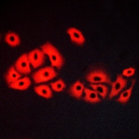 Immunofluorescent analysis of CRHR2 staining in A549 cells. Formalin-fixed cells were permeabilized with 0.1% Triton X-100 in TBS for 5-10 minutes and blocked with 3% BSA-PBS for 30 minutes at room temperature. Cells were probed with the primary antibody in 3% BSA-PBS and incubated overnight at 4 °C in a hidified chamber. Cells were washed with PBST and incubated with a AF594-conjugated secondary antibody (red) in PBS at room temperature in the dark.