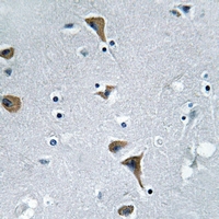 Immunohistochemical analysis of CSK (Phospho-S364) staining in human brain formalin fixed paraffin embedded tissue section. The section was pre-treated using heat mediated antigen retrieval with sodium citrate buffer (pH 6.0). The section was then incubated with the antibody at room temperature and detected using an HRP conjugated compact polymer system. DAB was used as the chromogen. The section was then counterstained with haematoxylin and mounted with DPX.