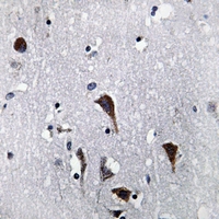 Immunohistochemical analysis of Cathepsin B staining in human brain formalin fixed paraffin embedded tissue section. The section was pre-treated using heat mediated antigen retrieval with sodium citrate buffer (pH 6.0). The section was then incubated with the antibody at room temperature and detected using an HRP conjugated compact polymer system. DAB was used as the chromogen. The section was then counterstained with haematoxylin and mounted with DPX. -