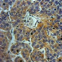 Immunohistochemical analysis of Cathepsin D HC staining in human liver cancer formalin fixed paraffin embedded tissue section. The section was pre-treated using heat mediated antigen retrieval with sodium citrate buffer (pH 6.0). The section was then incubated with the antibody at room temperature and detected using an HRP conjugated compact polymer system. DAB was used as the chromogen. The section was then counterstained with haematoxylin and mounted with DPX.
