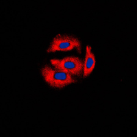 Immunofluorescent analysis of Cytochrome b5A staining in HeLa cells. Formalin-fixed cells were permeabilized with 0.1% Triton X-100 in TBS for 5-10 minutes and blocked with 3% BSA-PBS for 30 minutes at room temperature. Cells were probed with the primary antibody in 3% BSA-PBS and incubated overnight at 4 °C in a humidified chamber. Cells were washed with PBST and incubated with a DyLight 594-conjugated secondary antibody (red) in PBS at room temperature in the dark. DAPI was used to stain the cell nuclei (blue).