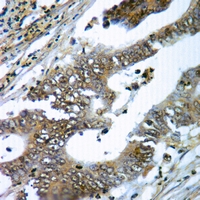 Immunohistochemical analysis of gp91 phox staining in human colorectal cancer formalin fixed paraffin embedded tissue section. The section was pre-treated using heat mediated antigen retrieval with sodium citrate buffer (pH 6.0). The section was then incubated with the antibody at room temperature and detected using an HRP conjugated compact polymer system. DAB was used as the chromogen. The section was then counterstained with haematoxylin and mounted with DPX.