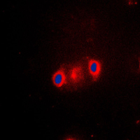 Immunofluorescent analysis of Cytochrome P450 2J2 staining in A549 cells. Formalin-fixed cells were permeabilized with 0.1% Triton X-100 in TBS for 5-10 minutes and blocked with 3% BSA-PBS for 30 minutes at room temperature. Cells were probed with the primary antibody in 3% BSA-PBS and incubated overnight at 4 °C in a humidified chamber. Cells were washed with PBST and incubated with a DyLight 594-conjugated secondary antibody (red) in PBS at room temperature in the dark. DAPI was used to stain the cell nuclei (blue).