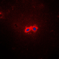 Immunofluorescent analysis of Cytochrome P450 26A1 staining in HepG2 cells. Formalin-fixed cells were permeabilized with 0.1% Triton X-100 in TBS for 5-10 minutes and blocked with 3% BSA-PBS for 30 minutes at room temperature. Cells were probed with the primary antibody in 3% BSA-PBS and incubated overnight at 4 °C in a humidified chamber. Cells were washed with PBST and incubated with a DyLight 594-conjugated secondary antibody (red) in PBS at room temperature in the dark. DAPI was used to stain the cell nuclei (blue).