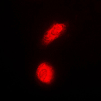 Immunofluorescent analysis of DAXX staining in HeLa cells. Formalin-fixed cells were permeabilized with 0.1% Triton X-100 in TBS for 5-10 minutes and blocked with 3% BSA-PBS for 30 minutes at room temperature. Cells were probed with the primary antibody in 3% BSA-PBS and incubated overnight at 4 °C in a humidified chamber. Cells were washed with PBST and incubated with a DyLight 594-conjugated secondary antibody (red) in PBS at room temperature in the dark.