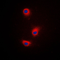 Immunofluorescent analysis of TRP2 staining in A375 cells. Formalin-fixed cells were permeabilized with 0.1% Triton X-100 in TBS for 5-10 minutes and blocked with 3% BSA-PBS for 30 minutes at room temperature. Cells were probed with the primary antibody in 3% BSA-PBS and incubated overnight at 4 °C in a humidified chamber. Cells were washed with PBST and incubated with a DyLight 594-conjugated secondary antibody (red) in PBS at room temperature in the dark. DAPI was used to stain the cell nuclei (blue).