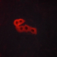 Immunofluorescent analysis of Dopamine Receptor D1 staining in MCF7 cells. Formalin-fixed cells were permeabilized with 0.1% Triton X-100 in TBS for 5-10 minutes and blocked with 3% BSA-PBS for 30 minutes at room temperature. Cells were probed with the primary antibody in 3% BSA-PBS and incubated overnight at 4 °C in a hidified chamber. Cells were washed with PBST and incubated with a AF594-conjugated secondary antibody (red) in PBS at room temperature in the dark.