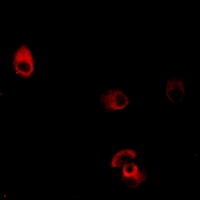 Immunofluorescent analysis of Dopamine Receptor D4 staining in MCF7 cells. Formalin-fixed cells were permeabilized with 0.1% Triton X-100 in TBS for 5-10 minutes and blocked with 3% BSA-PBS for 30 minutes at room temperature. Cells were probed with the primary antibody in 3% BSA-PBS and incubated overnight at 4 °C in a hidified chamber. Cells were washed with PBST and incubated with a AF594-conjugated secondary antibody (red) in PBS at room temperature in the dark.