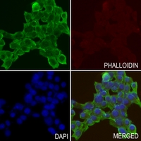 Immunofluorescent analysis of Desmoglein 3 staining in LS8 cells. Formalin-fixed cells were permeabilized with 0.1% Triton X-100 in TBS for 5-10 minutes and blocked with 3% BSA-PBS for 30 minutes at room temperature. Cells were probed with the primary antibody in 3% BSA-PBS and incubated overnight at 4 °C in a hidified chamber. Cells were washed with PBST and incubated with a AF488-conjugated secondary antibody (green) in PBS at room temperature in the dark. Phalloidin - AF594 was used to stain Actin filaments (red). DAPI was used to stain the cell nuclei (blue).