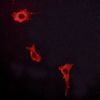 Immunofluorescent analysis of Endothelin A Receptor staining in LOVO cells. Formalin-fixed cells were permeabilized with 0.1% Triton X-100 in TBS for 5-10 minutes and blocked with 3% BSA-PBS for 30 minutes at room temperature. Cells were probed with the primary antibody in 3% BSA-PBS and incubated overnight at 4 °C in a hidified chamber. Cells were washed with PBST and incubated with a AF594-conjugated secondary antibody (red) in PBS at room temperature in the dark.