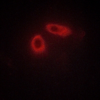 Immunofluorescent analysis of Ephrin A1 staining in HeLa cells. Formalin-fixed cells were permeabilized with 0.1% Triton X-100 in TBS for 5-10 minutes and blocked with 3% BSA-PBS for 30 minutes at room temperature. Cells were probed with the primary antibody in 3% BSA-PBS and incubated overnight at 4 °C in a hidified chamber. Cells were washed with PBST and incubated with a AF594-conjugated secondary antibody (red) in PBS at room temperature in the dark.