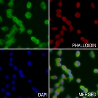 Immunofluorescent analysis of p300 staining in A2780 cells. Formalin-fixed cells were permeabilized with 0.1% Triton X-100 in TBS for 5-10 minutes and blocked with 3% BSA-PBS for 30 minutes at room temperature. Cells were probed with the primary antibody in 3% BSA-PBS and incubated overnight at 4 °C in a hidified chamber. Cells were washed with PBST and incubated with a AF488-conjugated secondary antibody (green) in PBS at room temperature in the dark. Phalloidin - AF594 was used to stain Actin filaments (red). DAPI was used to stain the cell nuclei (blue).
