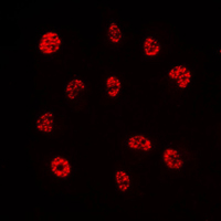 Immunofluorescent analysis of PE2 staining in HeLa cells. Formalin-fixed cells were permeabilized with 0.1% Triton X-100 in TBS for 5-10 minutes and blocked with 3% BSA-PBS for 30 minutes at room temperature. Cells were probed with the primary antibody in 3% BSA-PBS and incubated overnight at 4 °C in a humidified chamber. Cells were washed with PBST and incubated with a DyLight 594-conjugated secondary antibody (red) in PBS at room temperature in the dark.