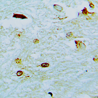 Immunohistochemical analysis of ETV1 staining in human brain formalin fixed paraffin embedded tissue section. The section was pre-treated using heat mediated antigen retrieval with sodium citrate buffer (pH 6.0). The section was then incubated with the antibody at room temperature and detected using an HRP conjugated compact polymer system. DAB was used as the chromogen. The section was then counterstained with haematoxylin and mounted with DPX. -