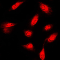 Immunofluorescent analysis of c-FER staining in HeLa cells. Formalin-fixed cells were permeabilized with 0.1% Triton X-100 in TBS for 5-10 minutes and blocked with 3% BSA-PBS for 30 minutes at room temperature. Cells were probed with the primary antibody in 3% BSA-PBS and incubated overnight at 4 °C in a humidified chamber. Cells were washed with PBST and incubated with a DyLight 594-conjugated secondary antibody (red) in PBS at room temperature in the dark.