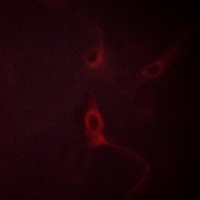 Immunofluorescent analysis of FGFR1 (Phospho-Y654) staining in COS7 cells. Formalin-fixed cells were permeabilized with 0.1% Triton X-100 in TBS for 5-10 minutes and blocked with 3% BSA-PBS for 30 minutes at room temperature. Cells were probed with the primary antibody in 3% BSA-PBS and incubated overnight at 4 °C in a hidified chamber. Cells were washed with PBST and incubated with a AF594-conjugated secondary antibody (red) in PBS at room temperature in the dark.