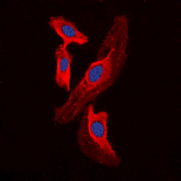 Immunofluorescent analysis of FHIT staining in HEK293T cells. Formalin-fixed cells were permeabilized with 0.1% Triton X-100 in TBS for 5-10 minutes and blocked with 3% BSA-PBS for 30 minutes at room temperature. Cells were probed with the primary antibody in 3% BSA-PBS and incubated overnight at 4 °C in a humidified chamber. Cells were washed with PBST and incubated with a DyLight 594-conjugated secondary antibody (red) in PBS at room temperature in the dark. DAPI was used to stain the cell nuclei (blue).